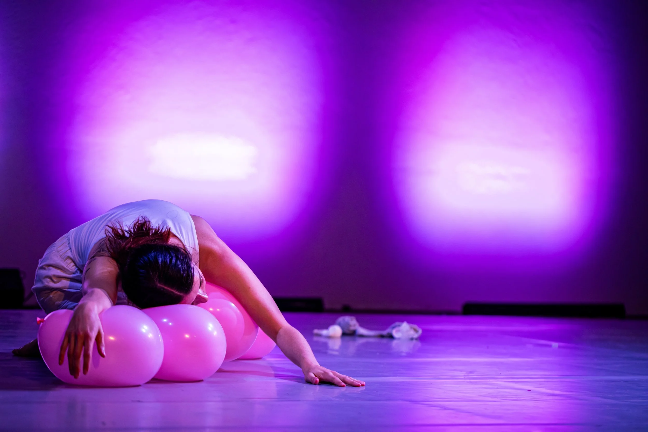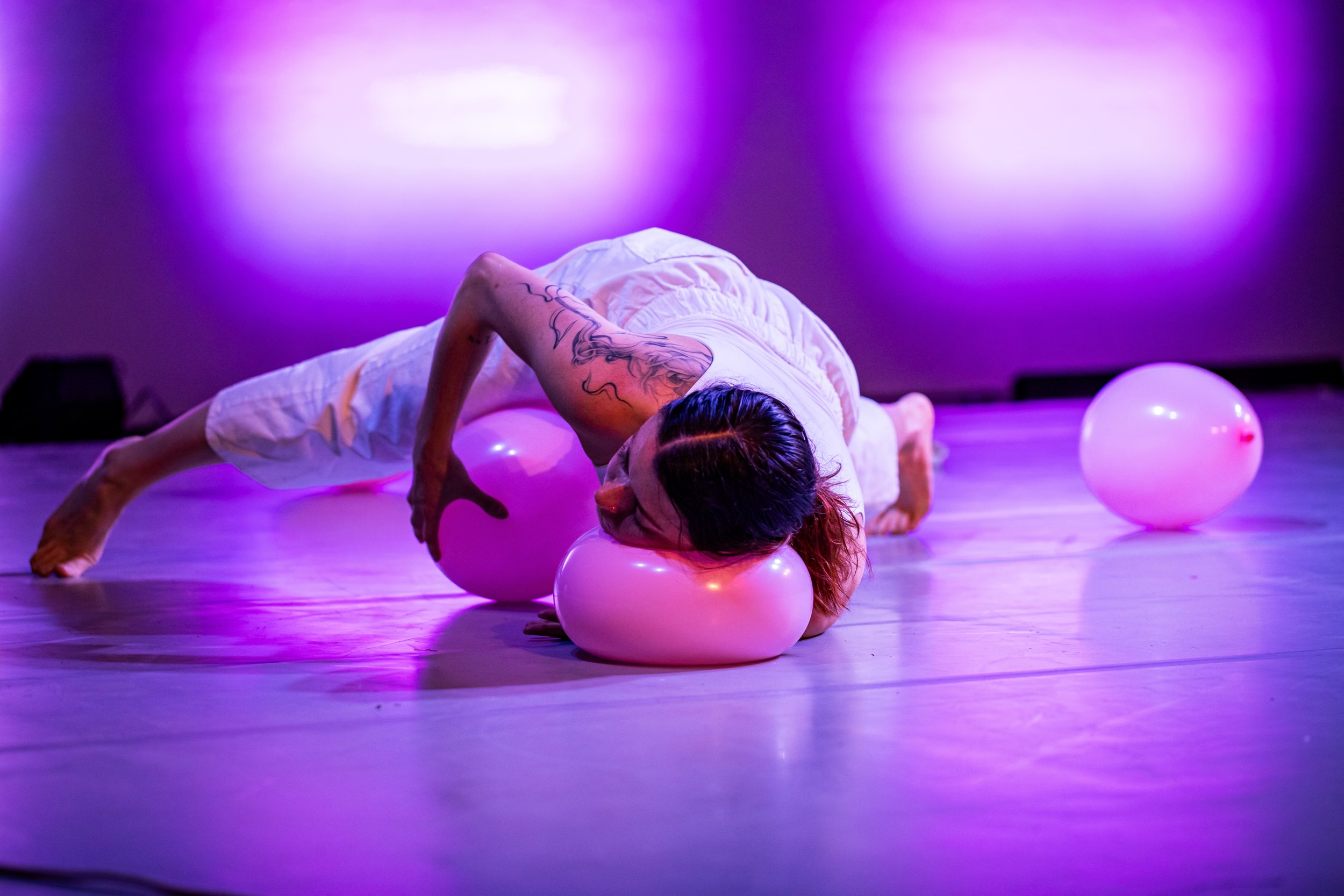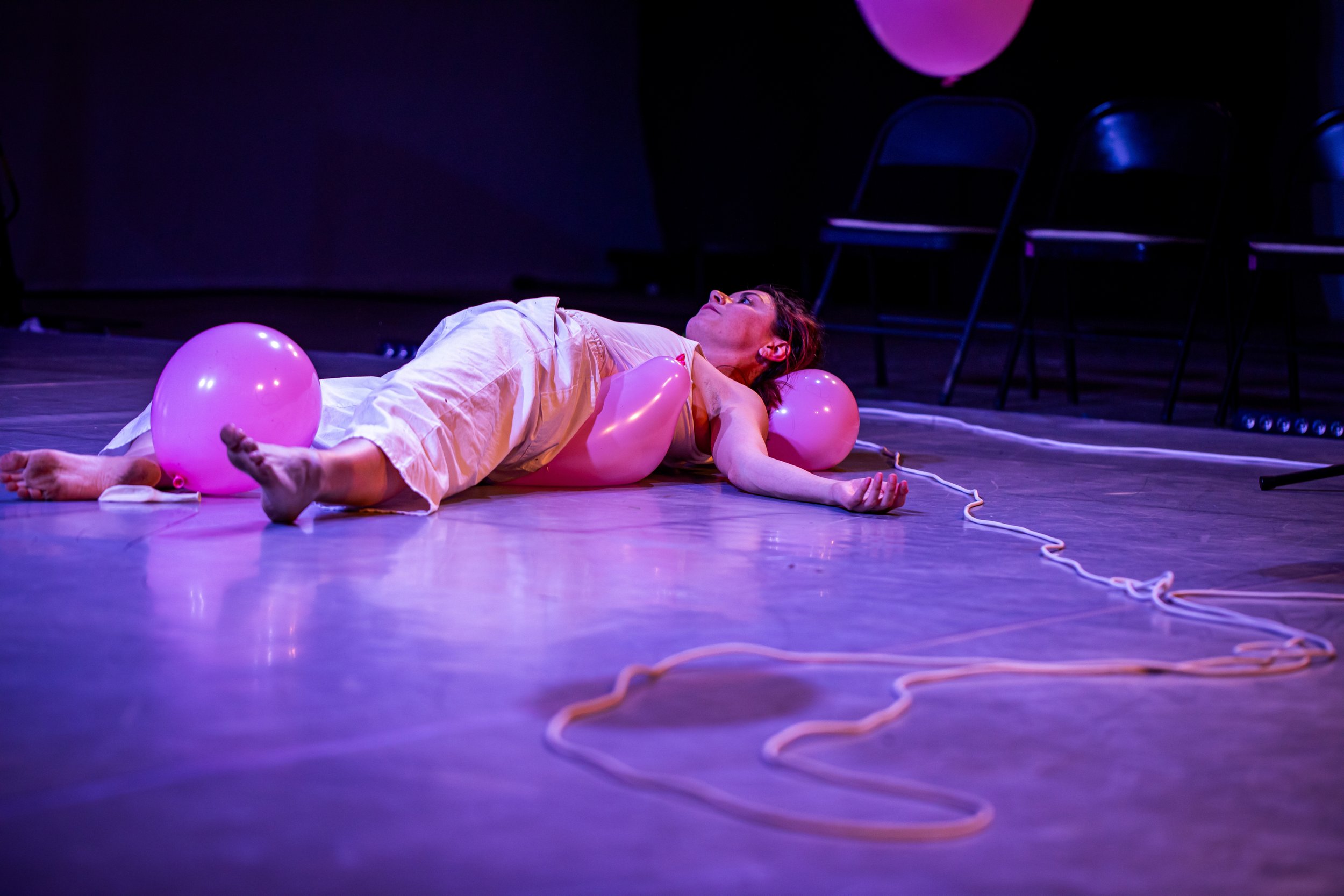 unbearable lightness is a work in development that is both a durational instillation and an evening-length performance. The project is a series of performance reveries on being alive, breath, and balloons. It begins as an exploration of breath with a lightweight object: a latex balloon. As a balloon gives shape to breath, playful opportunities emerge for breath to give shape to the body and for the body to be held by breath. One lone white balloon becomes many bubblegum pink balloons, and 99 red balloons–an ode to Nena’s anti-war classic.